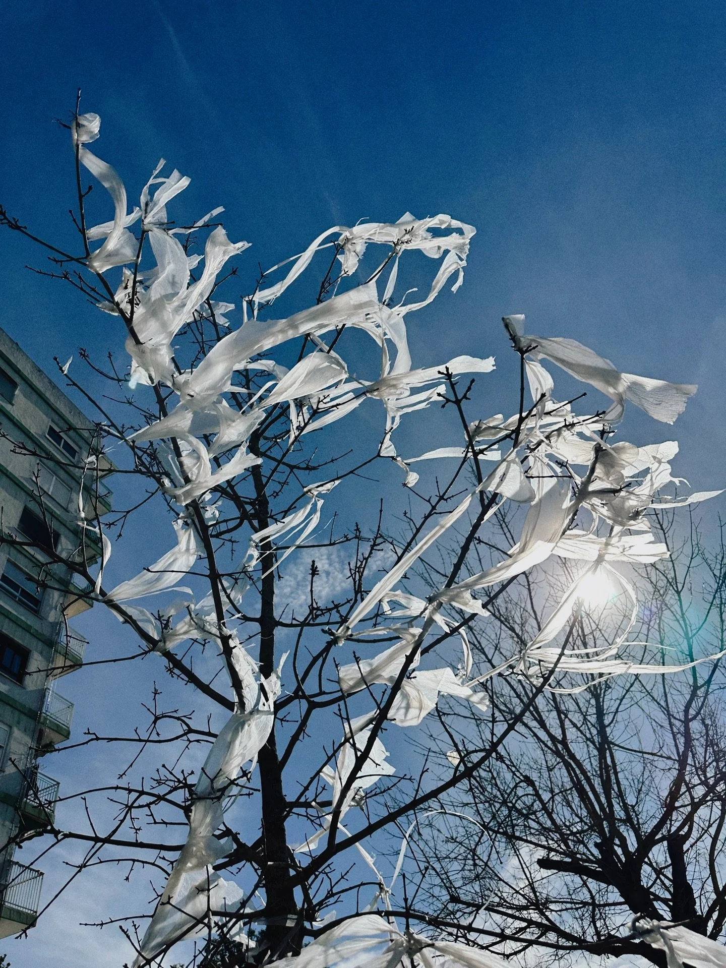 Las obras implican suciedad, desastre y plásticos, ya se sabe. pero este árbol está fuera de la zona de obras, la mierda que lo adorna no sabemos de dónde viene, pero lleva un tiempo encaramada a sus ramas. Me ha parecido un símbolo de la relación que tiene el hombre con la naturaleza.