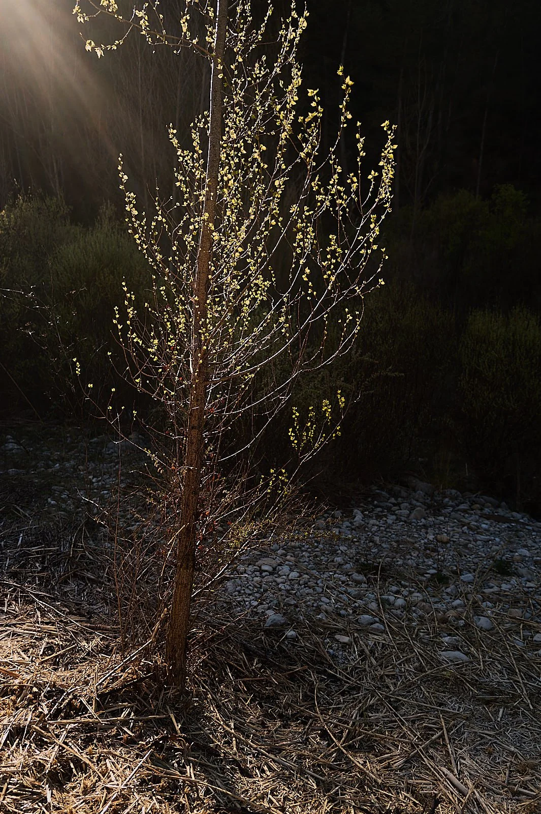 Este chopo joven del camino del rio lo tiene claro, en dos semanas estará ya dándolo todo con sus hojas verde fluorescentes brillando a contraluz.